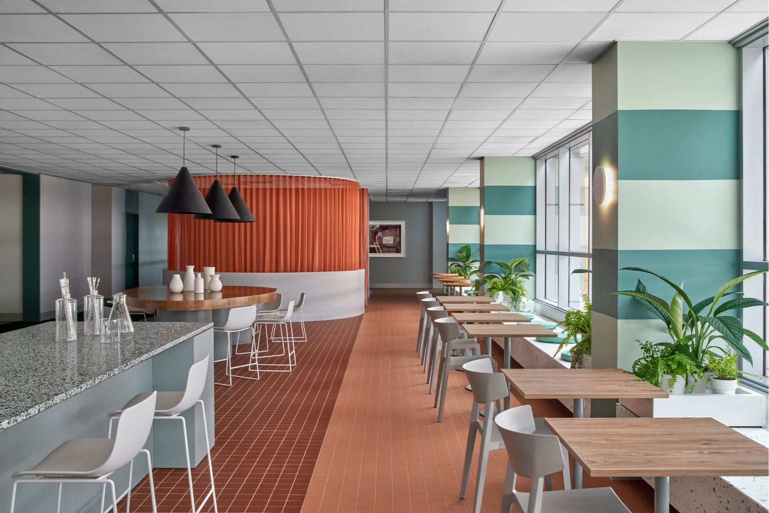 Additional collaboration zones punctuate the work floor with sheer perforated curtains used to create privacy, while still being part of an open plan scheme. In the large kitchen that, along with the adjacent seminar area, allows them to host large social gatherings, tiles in red and caramel are offset by a terrazzo benchtop and tables adding textural contrast.