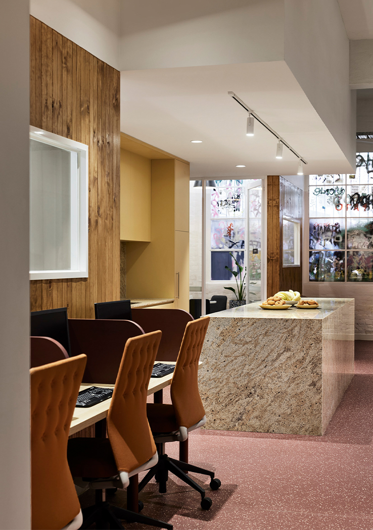Supporting employees with a non-hierarchical culture, the design improves access, safety, and security, providing quiet retreats for staff. The soothing palette, featuring warm brick walls, timber accents, and vibrant details, contrasts with the urban setting, fostering hope and worthiness.