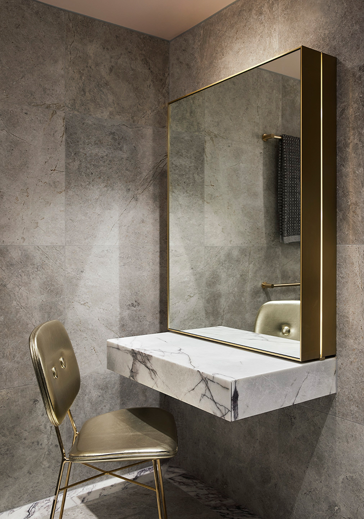 Inspired by the idea of a jewelry box, Cornerstone International Solutions created a compact and fabulous space filled with notable elements and hidden surprises concealed within the apartment’s surfaces.