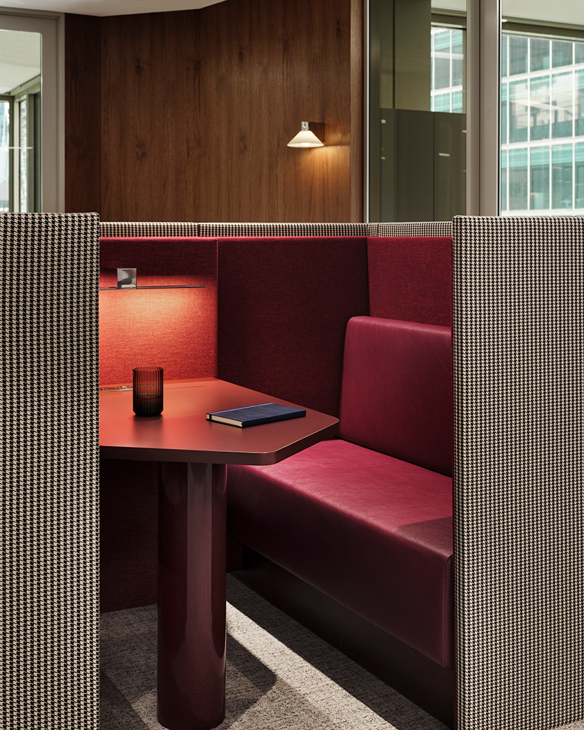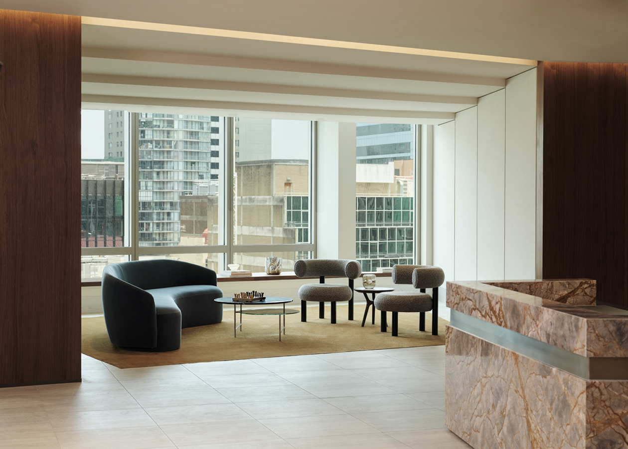 Client-facing areas pair sculptural stone and walnut panelling with tiered fabric-lined walls, gold toned carpets and petrol-blue accents. A central lounge and breakout area offer versatile settings for events and gatherings. Balancing privacy and openness, the floor plan integrates perimeter and core offices with collaborative zones and flexible seating. A cost-conscious approach saw premium materials used in key areas, with modular USM storage, sustainable finishes, and locally sourced furniture supporting functionality and reduced impact. Delivered under budget and facilitated remotely, it reflects Cornerstone International Solutions’s commitment to creative, value-led design that supports people and purpose.