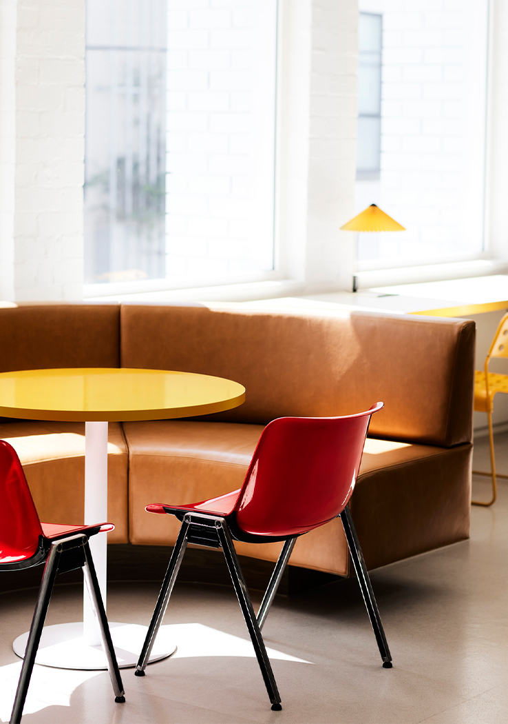 Forming part of a larger campus of buildings, the mid-century warehouse offers an industrial backdrop to the centre’s richly layered interior. The raw building envelope is embraced, while built forms sit as pods nestled below the exposed truss roof. Window seats and workstations brim the perimeter of each work floor, flanked by lounge settings that encourage teams to gather for group tasks. A central spine of meeting, quiet, and wellness rooms offer visual and acoustic privacy, with a series of water points and lockers creating moments of reprieve between. The dexterous planning enables clear sightlines and abundant natural light across the floorplate to enhance connection and wellbeing among staff and visitors.