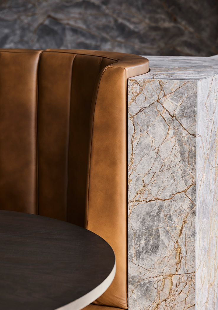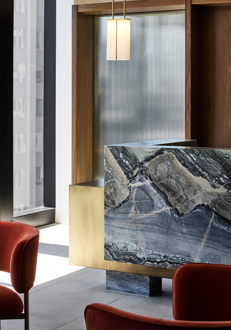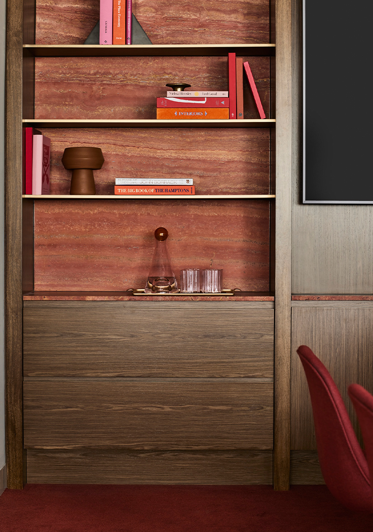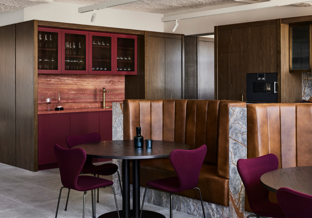 On arrival, their hospitable identity is reflected by a welcoming lounge, rich in colour and texture. A bespoke two-sided sofa accommodates small groups and individuals, bordered by a luxurious kitchen that blurs the boundaries between client and visitor domains. High quality appliances, a large pantry, glass-fronted cabinets, and a striking bar lined with striated red travertine allow their to comfortably host and entertain guests, elevated by café-style booth seats and lush hanging planters. The unusual positioning of the kitchen and breakout space unlocked the floor plate, eliminating unnecessary circulation and allowing us to accommodate their functional needs within a relatively compact floor plate.