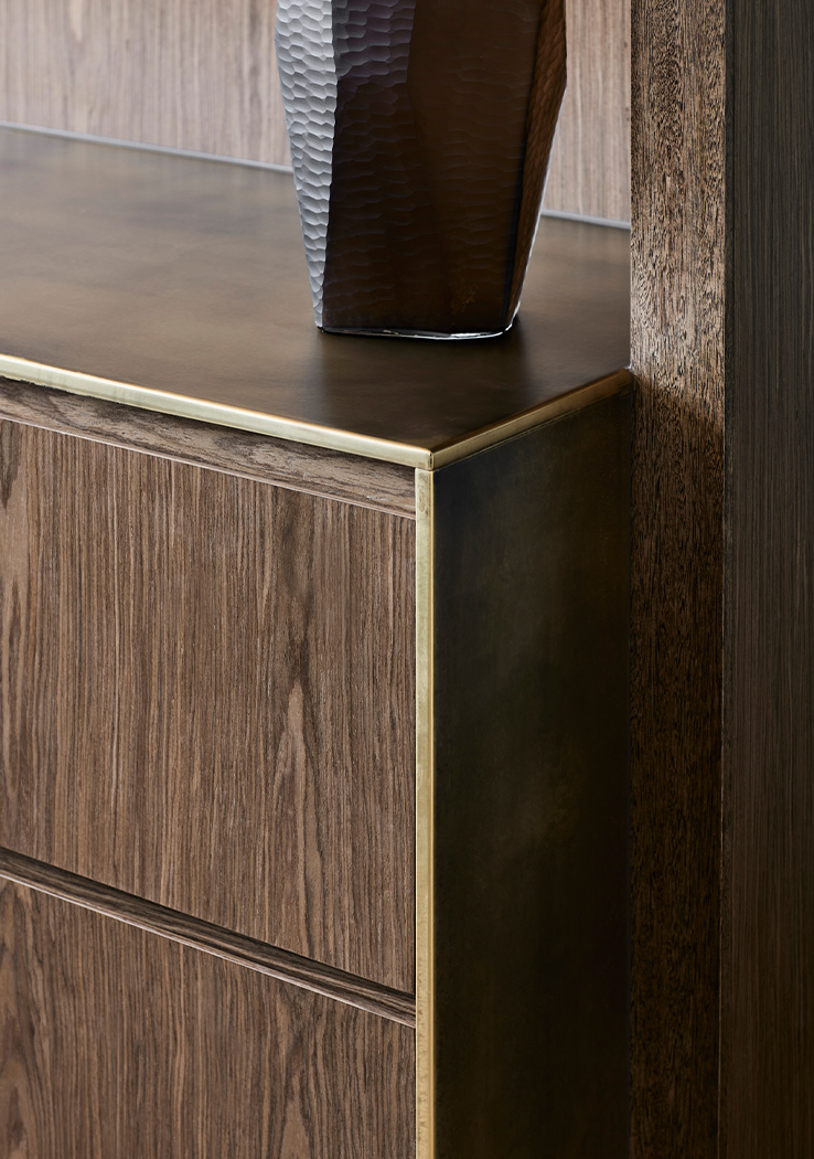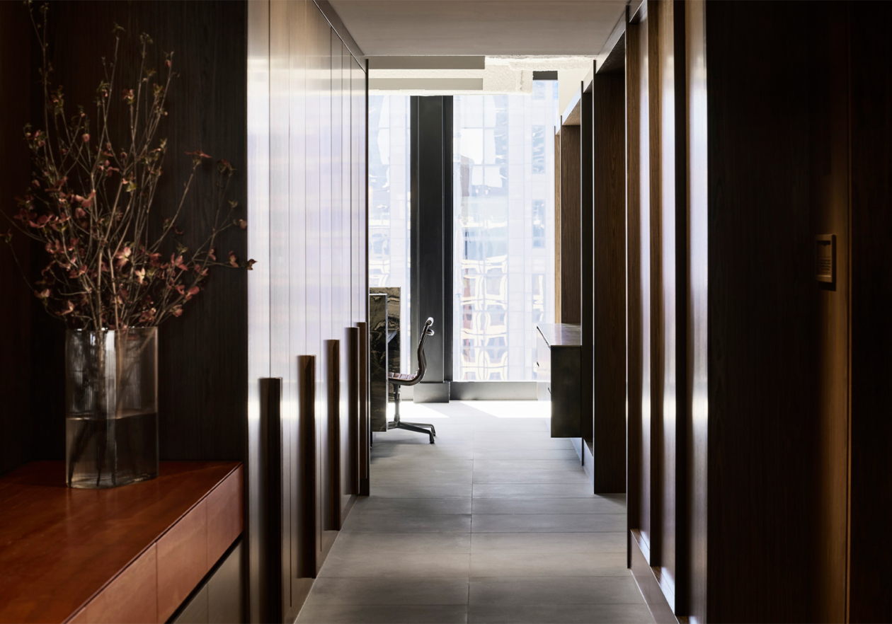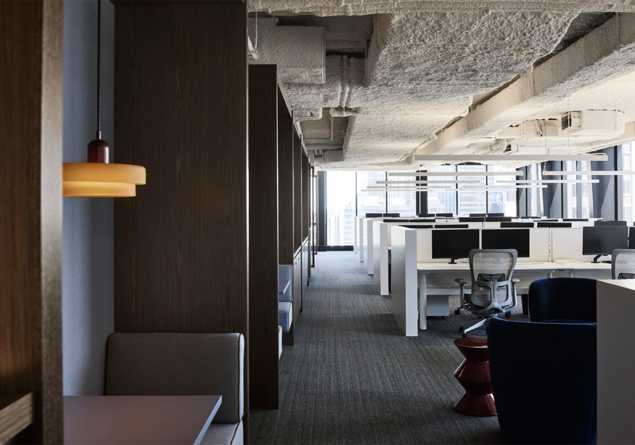 On arrival, their hospitable identity is reflected by a welcoming lounge, rich in colour and texture. A bespoke two-sided sofa accommodates small groups and individuals, bordered by a luxurious kitchen that blurs the boundaries between client and visitor domains. High quality appliances, a large pantry, glass-fronted cabinets, and a striking bar lined with striated red travertine allow their to comfortably host and entertain guests, elevated by café-style booth seats and lush hanging planters. The unusual positioning of the kitchen and breakout space unlocked the floor plate, eliminating unnecessary circulation and allowing us to accommodate their functional needs within a relatively compact floor plate.