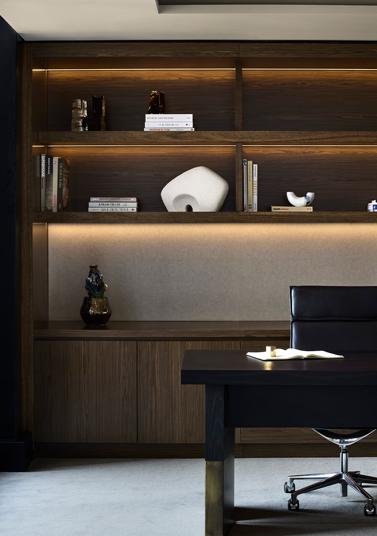 Cornerstone International Solutions utilised the floor plan’s east wing to host a boardroom, meeting rooms, collaboration space, quiet rooms and chairman’s office, finished in deep, moody finishes. Beyond, the longer west wing accommodates a light-filled open-plan workspace and Managing Director’s office, each afforded striking views across the bay. Adjacent joinery elegantly conceals lightboxes, white boards, pin boards, storage, and meeting booth utilities – highly functional, yet thoughtfully detailed to engender warmth, and encourage staff collaboration.